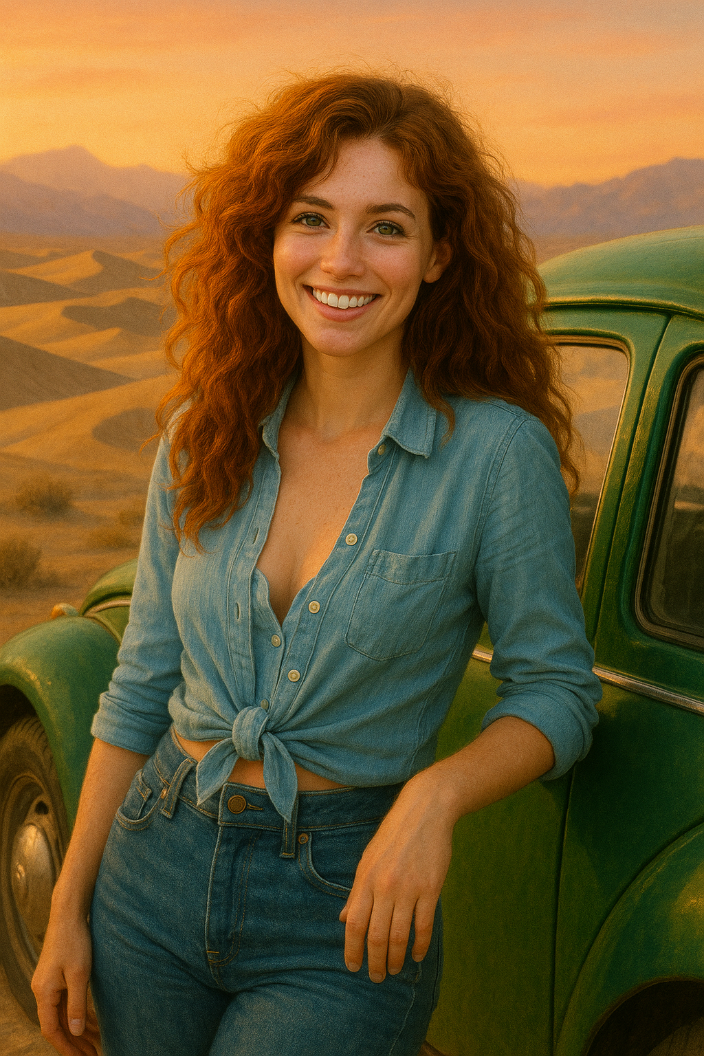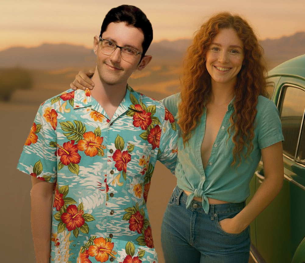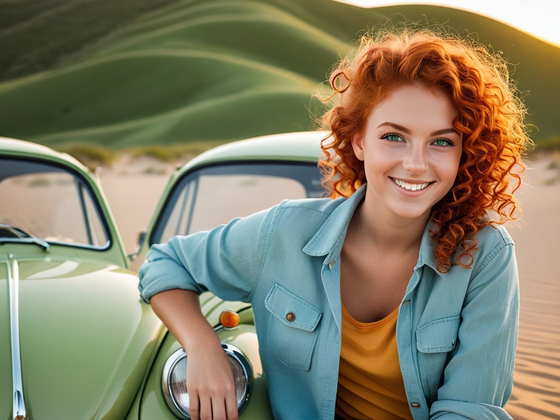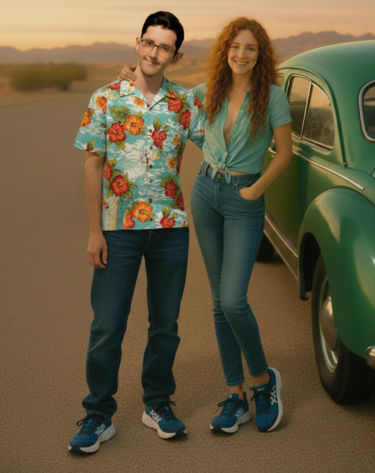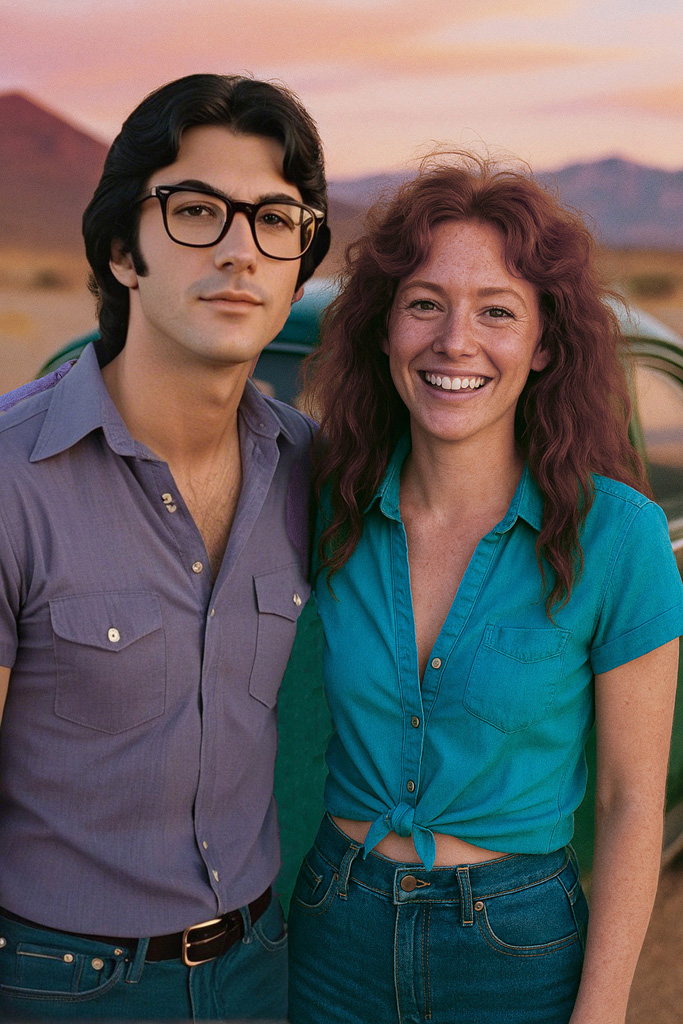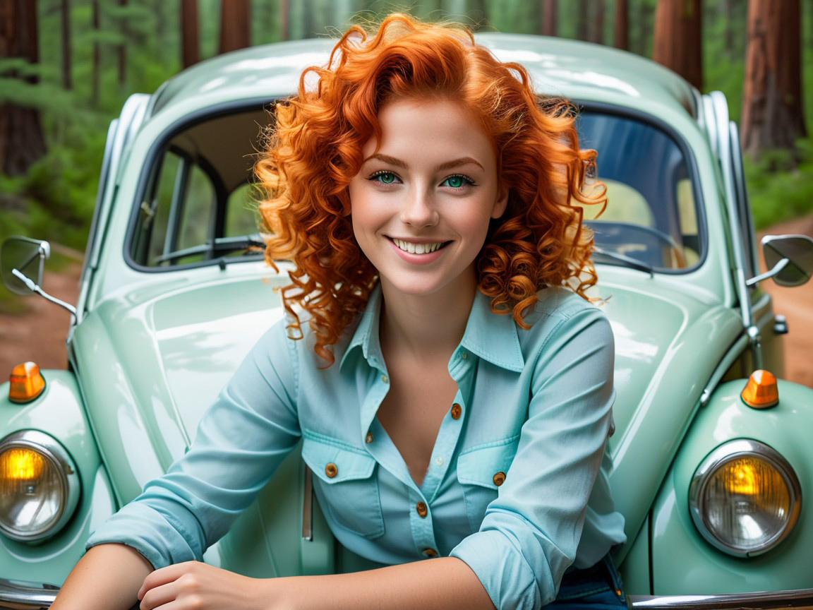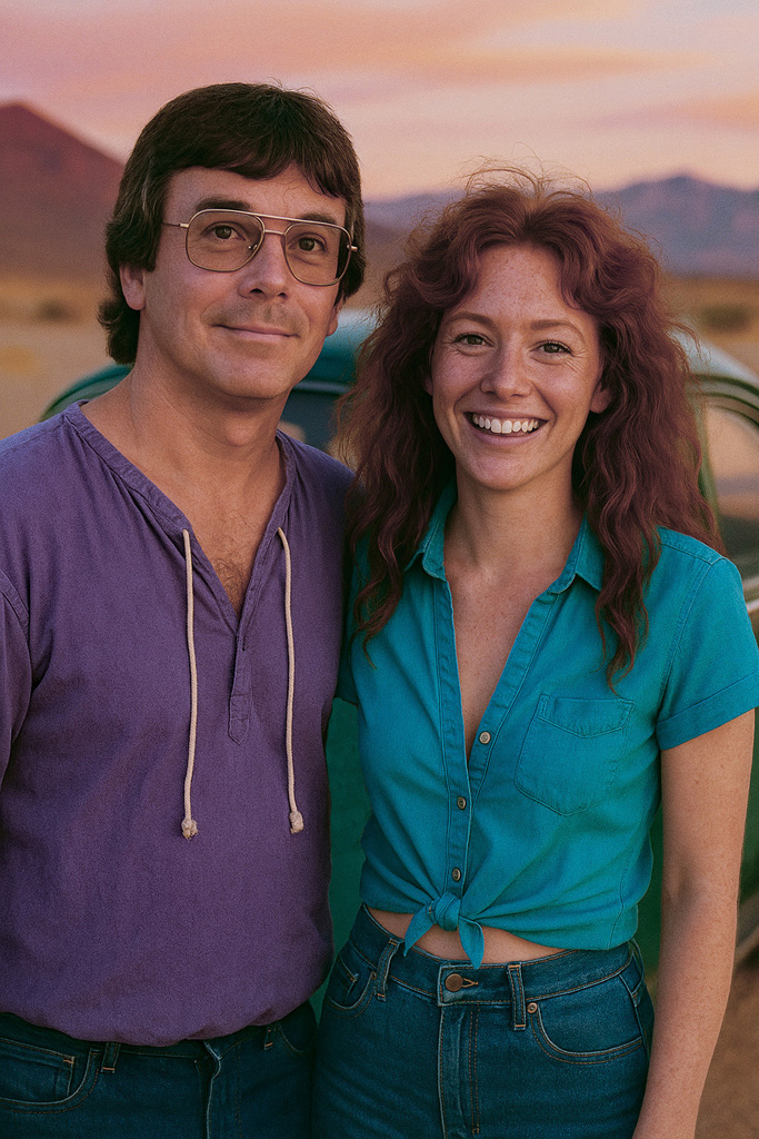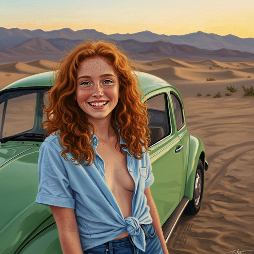 The next set of four pictures are my "Ernie and Christy" pictures. I had a picture of me from 1971 that I used and by then had an AI picture of Christy that I liked. We did wear blue jeans and I decided to use a Hawaiian shirt for me since I don't remember or have any of the shirts I wore back then. Christy did NOT wear her shirt unbuttoned like that in public, but we had enough shirt and button adventures when we were alone and in private that I decided the pictures were appropriate for my website. It's an unfair liberty that I'm taking sine I'm the one creating this website. That said, I'm sure Christy would not approve of these pictures...but they are my form of memories of that time. Her face and hair in these four pictures are almost exactly how I remember Christy looked. And I did put the little green Volkswagen Bug in the picture too as that had a role in our relationship also.