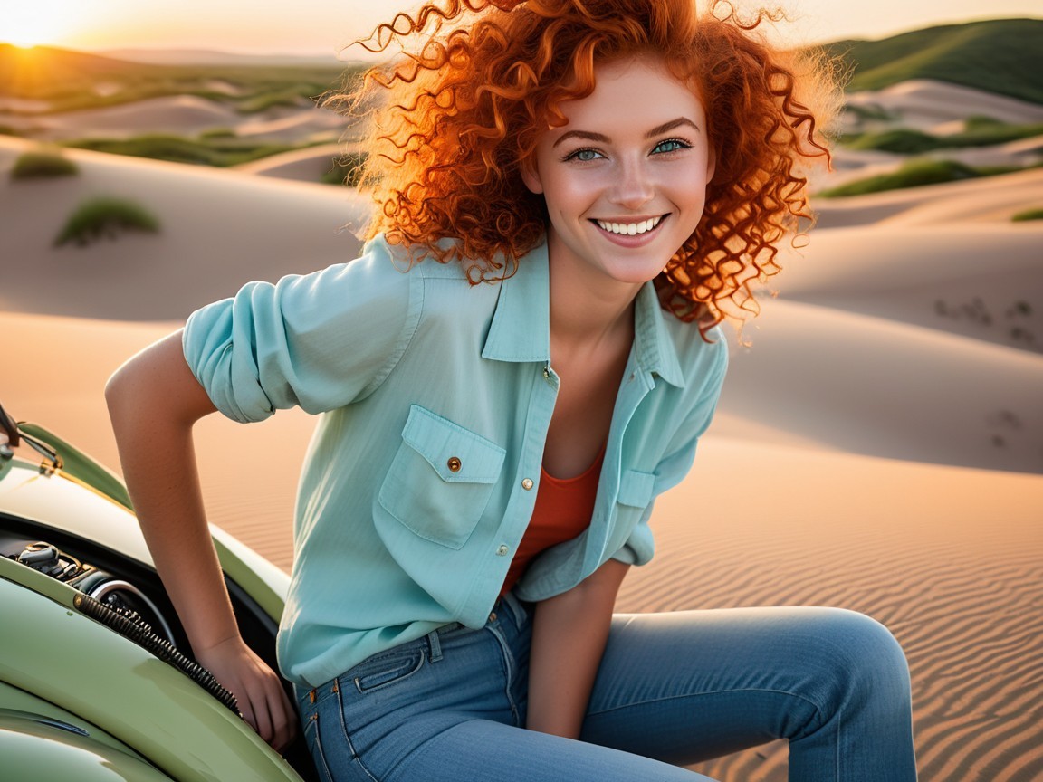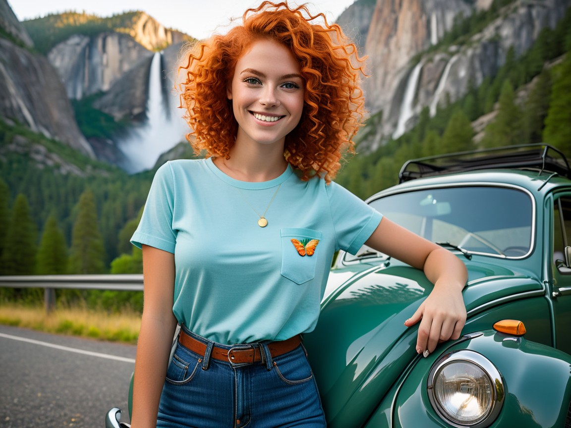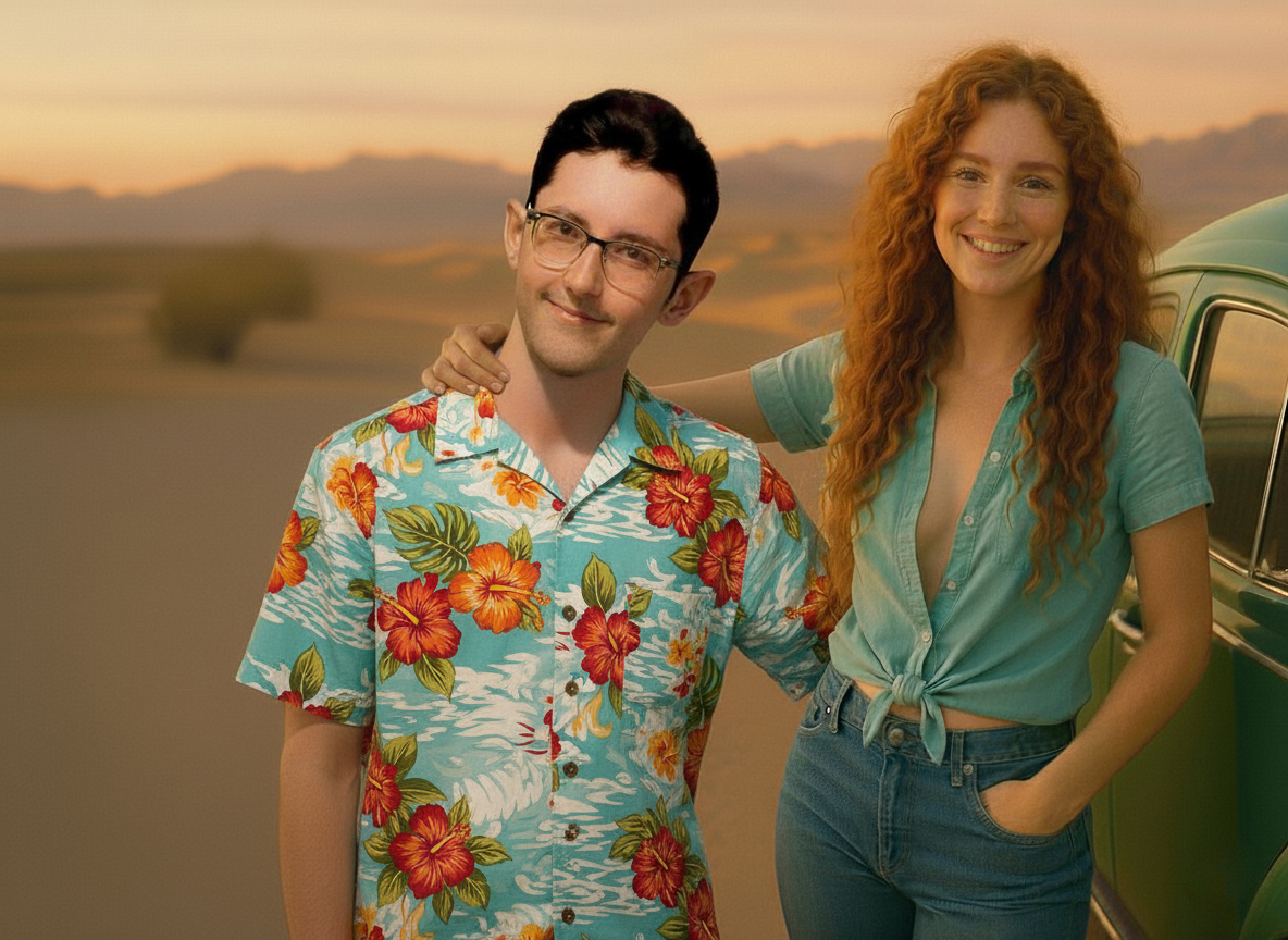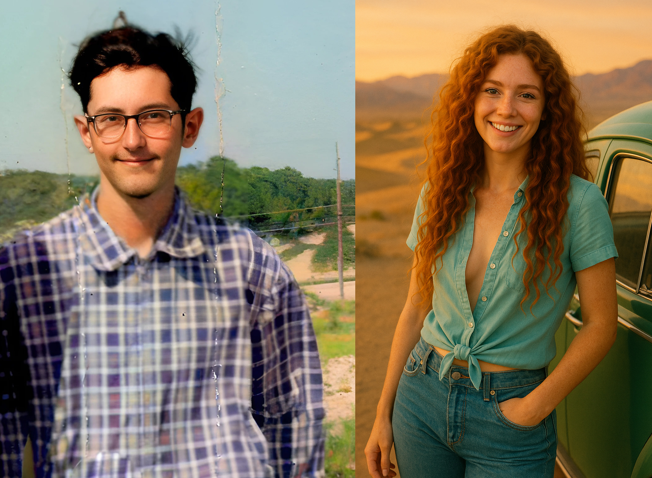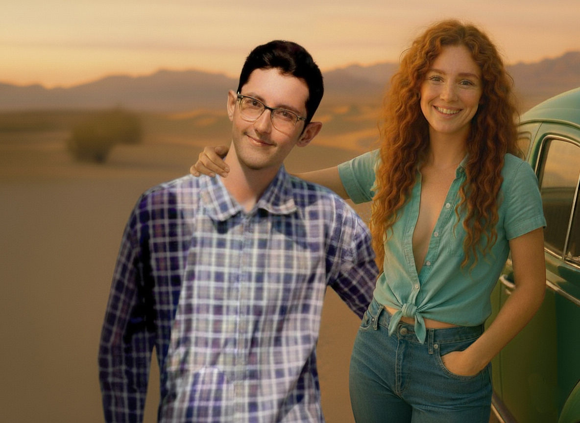 The next set of four pictures are my "Ernie and Christy" pictures. I had a picture of me from 1971 that I used and by then had an AI picture of Christy that I liked. We did wear blue jeans and I decided to use a Hawaiian shirt for me since I don't remember or have any of the shirts I wore back then. Christy did NOT wear her shirt unbuttoned like that in public, but we had enough shirt and button adventures when we were alone and in private that I decided the pictures were appropriate for my website. It's an unfair liberty that I'm taking sine I'm the one creating this website. That said, I'm sure Christy would not approve of these pictures...but they are my form of memories of that time. Her face and hair in these four pictures are almost exactly how I remember Christy looked. And I did put the little green Volkswagen Bug in the picture too as that had a role in our relationship also.