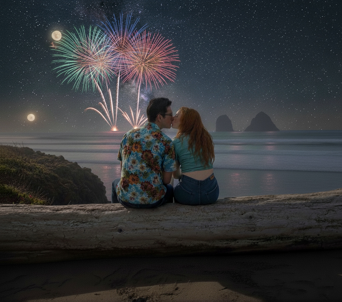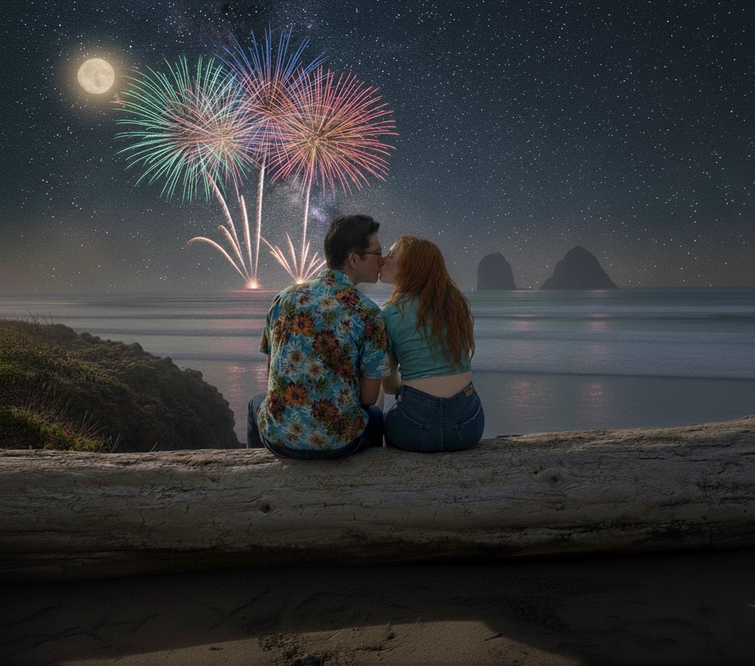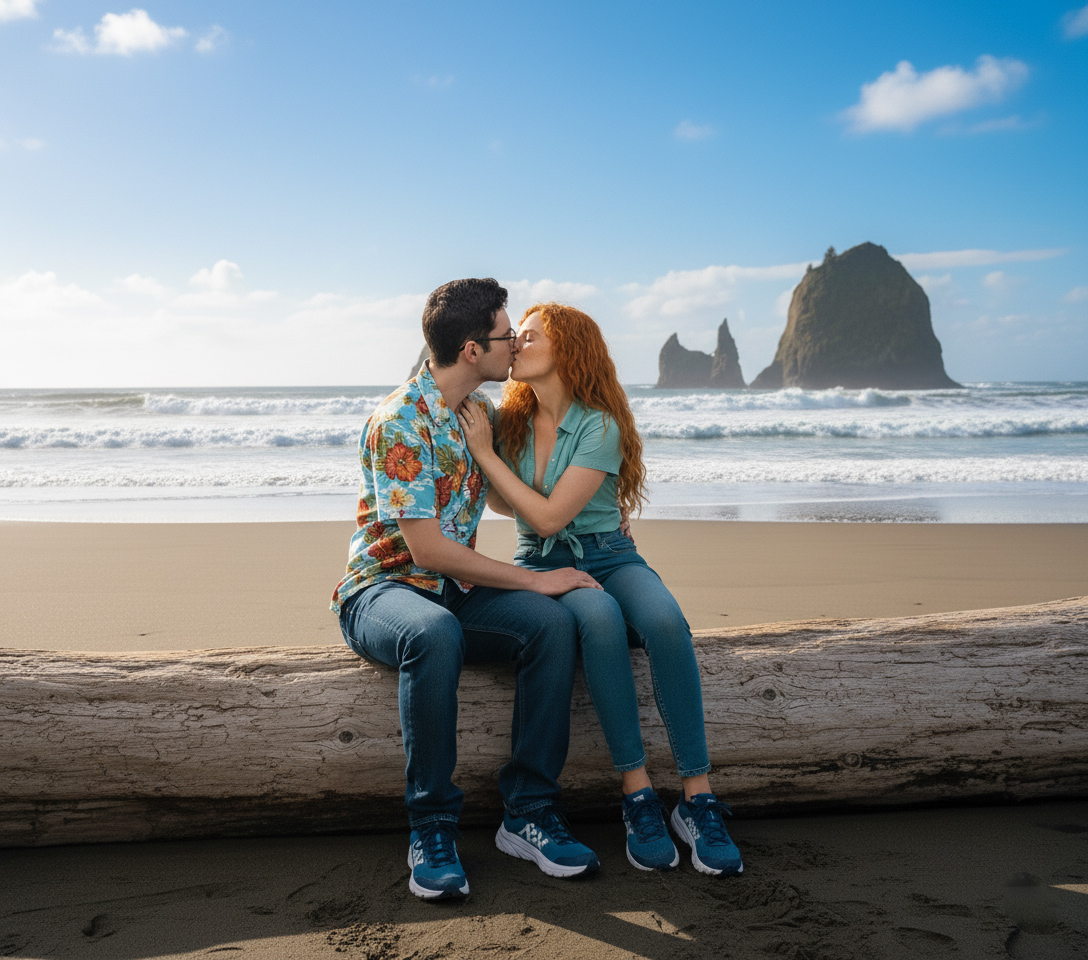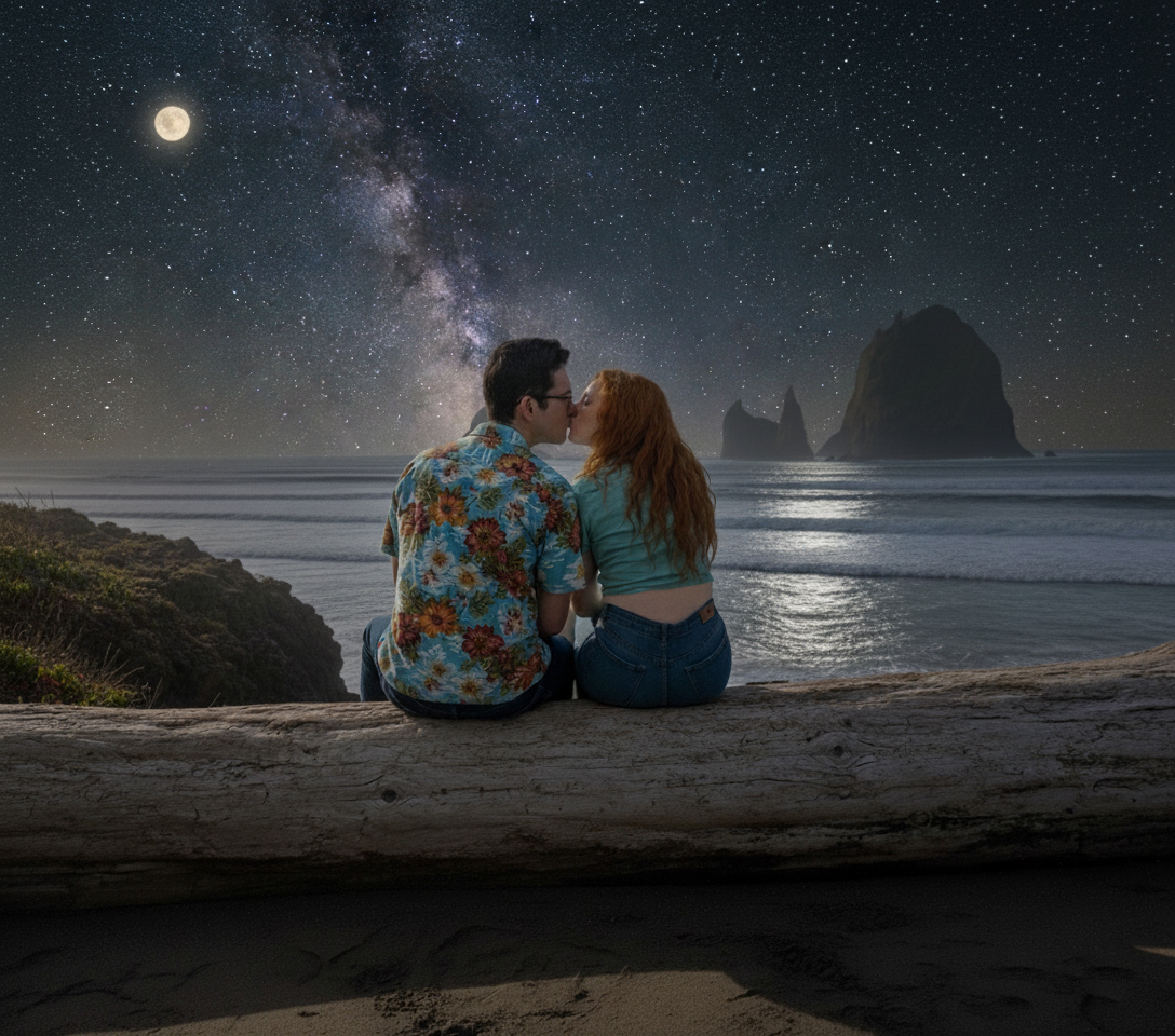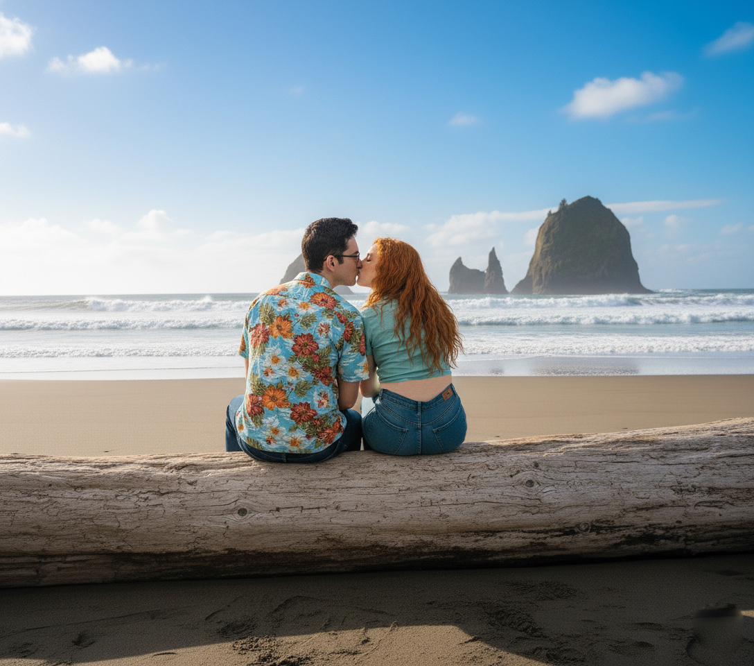 We are kissing on a log overlooking the beach.