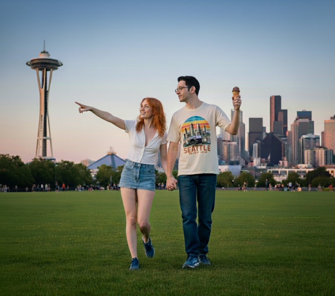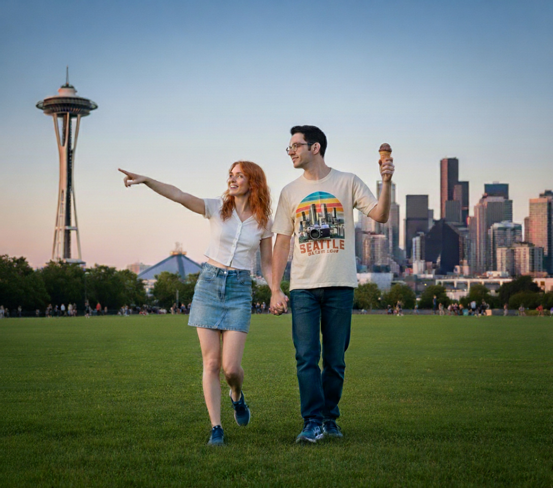 The next three pictures are Christy and I at the Sapce Needle Park, walking around and enjoying our time together. The Space Needle was awesome to me, but Christy had seen it lots of time so she was making fun of me as we walked and talked. This picture also reminds me of a time at a different park where we had a picnic on a blanket.